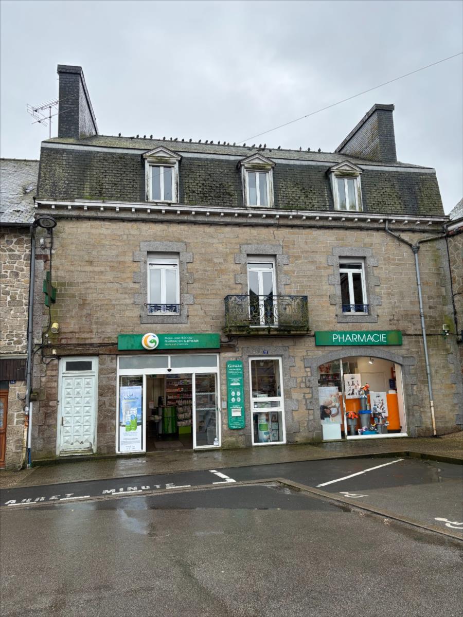 Ensemble immobilier de caractère au cœur du bourg comprenant – un local professionnel à usage de pharmacie au rez de chaussé de 83,5 m² Au premier étage , couloir desservant pièce de vie, cuisine, , une salle de préparation, wc, une chambre Au second étage : deux chambre, salle de bains, wc, un pièce